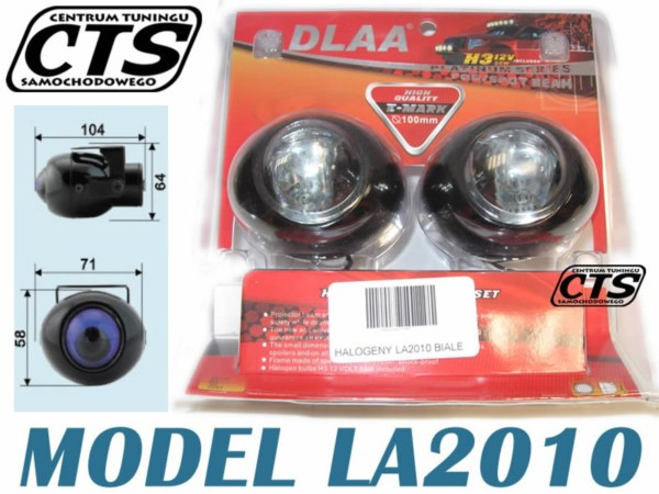 Halogeny samochodowe soczewkowe, z żarówką H3 12V 55W. W zestawie znajdują się żarówki, mocowania, przewody. Metalowa obudowa. Wymiary: wysokość 58 mm, szerokość 71mm, głębokość 104 mm. Homologacja E3.